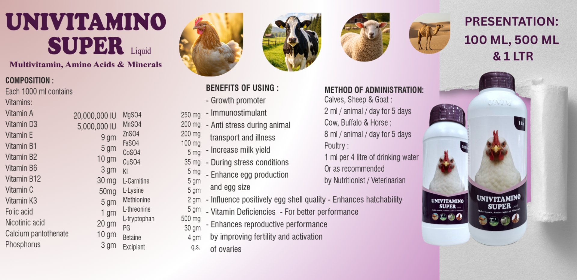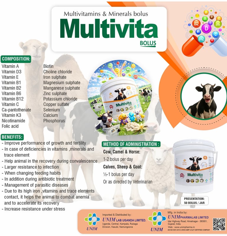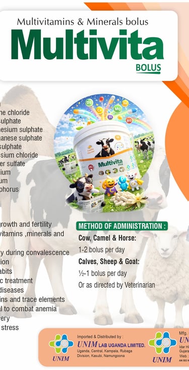 Backed by strong expertise in pharmaceutical development, manufacturing, and marketing, Unim Pharma Lab Limited produces a wide range of veterinary formulations in diverse dosage forms, including oral liquids, water-soluble powders, vitamins, herbal products, bulk formulations, feed supplements, tablets, and boluses. Unim Lab Uganda directly supplies these products, ensuring consistent quality from manufacturing to end use.